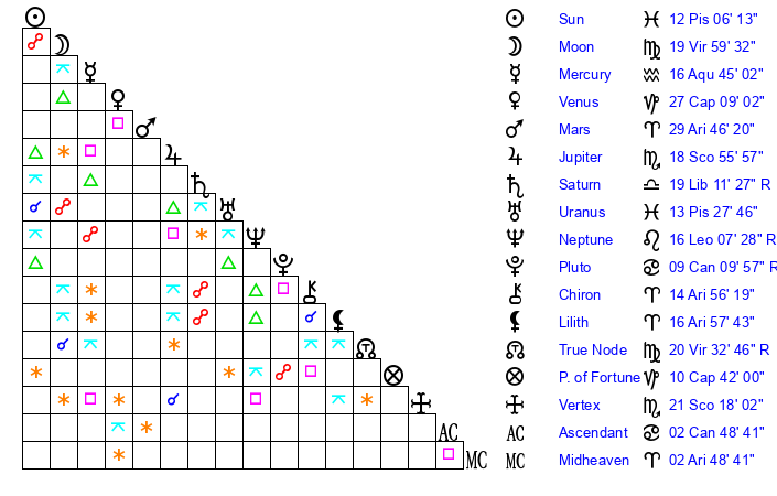 | Saturn | 19 Libra 52 | 20 Pisces 57 | 14 Libra 2 |