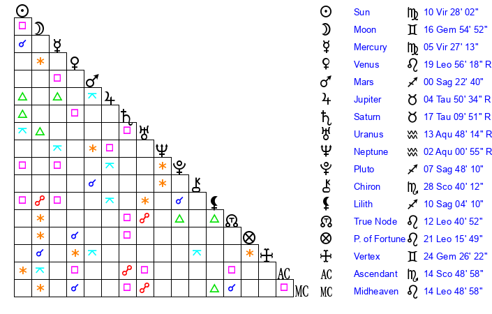 Moon | 16 Gemini 47 | 16 Capricorn 46 | 28 Taurus 57 |
