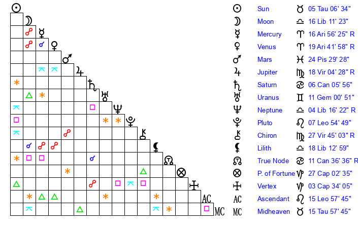 | Sun | 5 Taurus 7 | 5 Taurus 44 | 21 Cancer 52 |