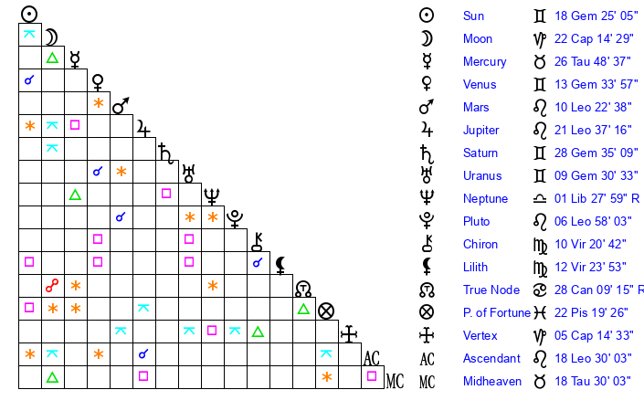 Pluto | 6 Leo 58 | 3 Aquarius 31 | 9 Leo 9 |