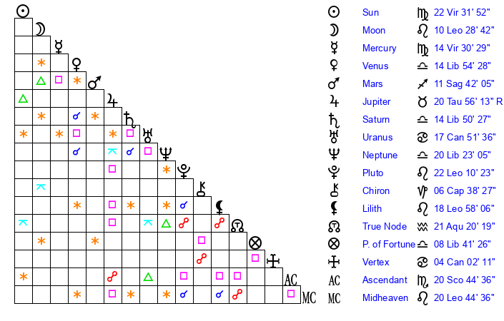 Pluto | 22 Leo 10 | 1 Aquarius 32 | 23 Leo 16 |