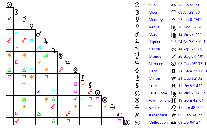 | Mars | 12 Virgo 58 | 20 Scorpio 53 | 16 Scorpio 41 |