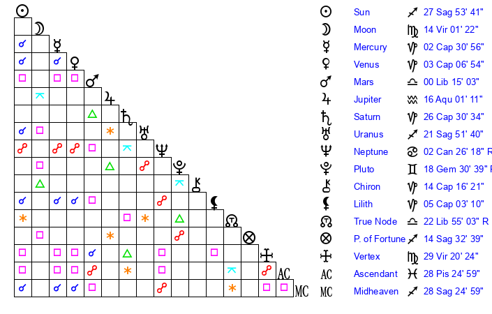 | Saturn | 26 Capricorn 57 | 25 Pisces 31 | 9 Aquarius 9 |
