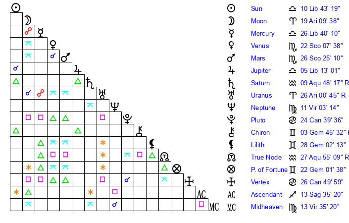 | Sun | 10 Libra 43 | 11 Libra 26 | 13 Capricorn 22 |