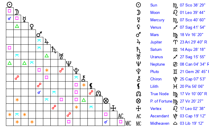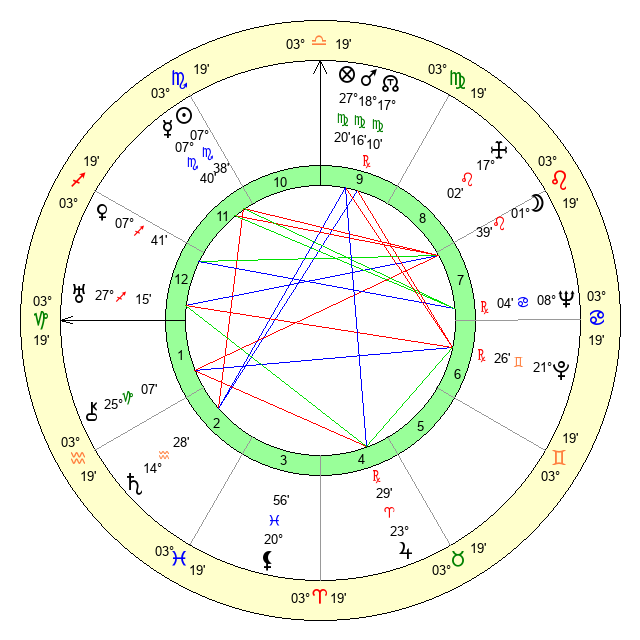 | Mars | 18 Virgo 16 | 27 Scorpio 7 | 19 Scorpio 37 |