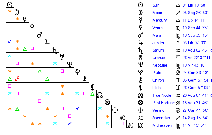 | Moon | 5 Sagittarius 21 | 3 Scorpio 59 | 25 Aries 28 |