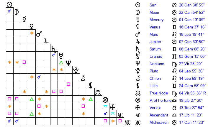 | Sun | 20 Cancer 39 | 21 Cancer 33 | 10 Libra 50 |