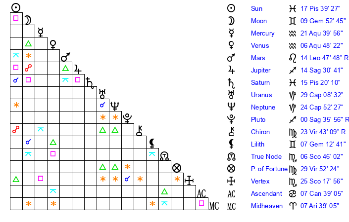 Moon | 9 Gemini 45 | 13 Cancer 43 | 11 Cancer 25 |