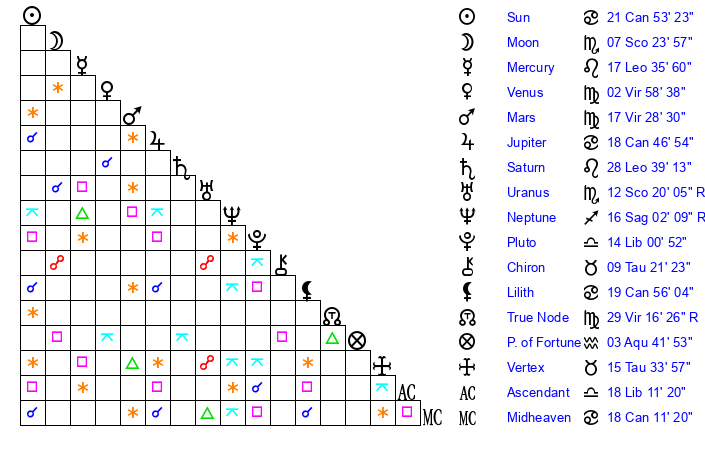 | Sun | 21 Cancer 53 | 22 Cancer 30 | 6 Virgo 57 |