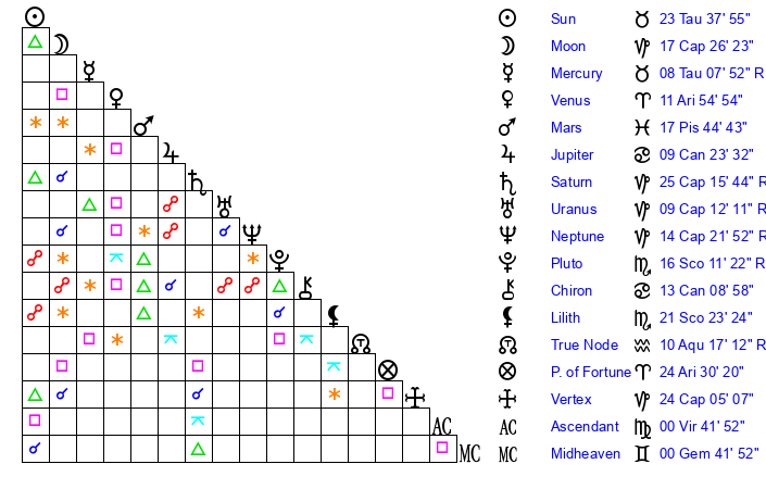 | Saturn | 25 Capricorn 18 | 29 Pisces 3 | 23 Capricorn 53 |