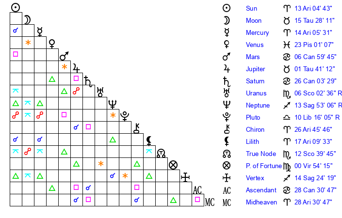 | Moon | 15 Taurus 27 | 12 Gemini 27 | 10 Pisces 1 |