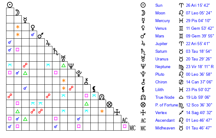 | Pluto | 0 Leo 37 | 3 Aquarius 44 | 2 Leo 3 |