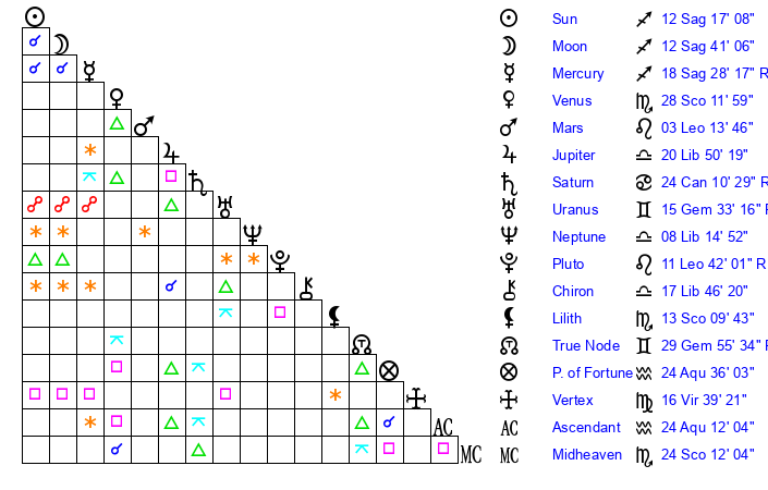 Moon | 12 Sagittarius 46 | 24 Capricorn 51 | 7 Scorpio 24 |