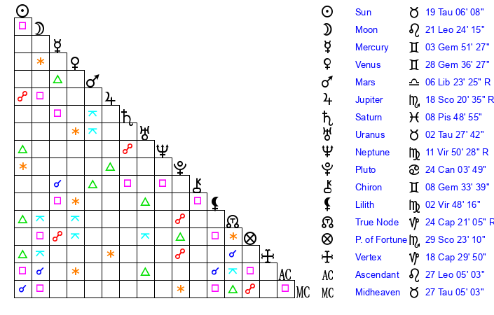 | Sun | 19 Taurus 6 | 20 Taurus 17 | 15 Leo 12 |