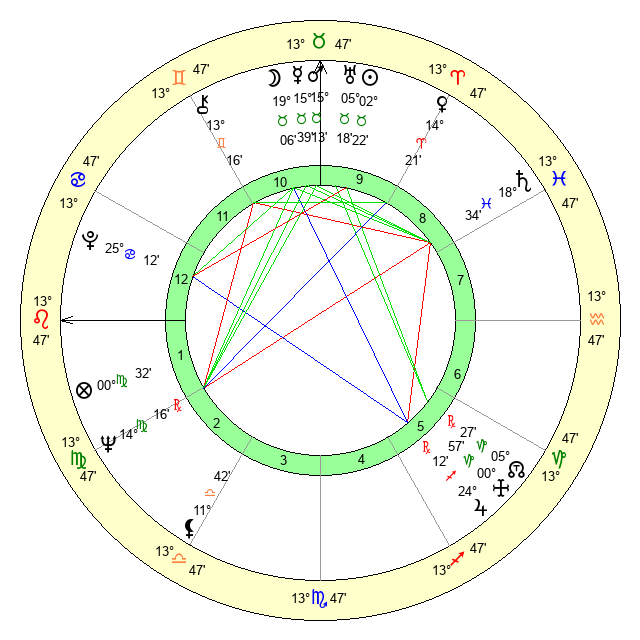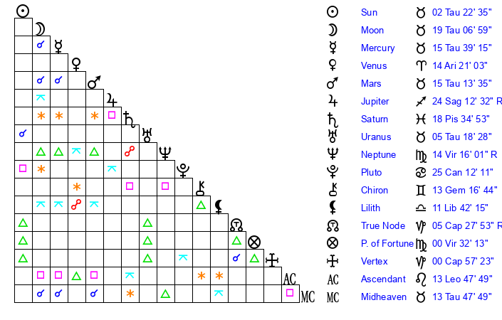 | Moon | 19 Taurus 7 | 22 Aquarius 59 | 22 Leo 39 |