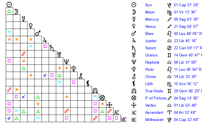 | Neptune | 8 Libra 32 | 27 Pisces 12 | 7 Libra 41 |