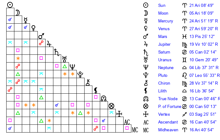 Sun | 21 Aries 9 | 21 Aries 46 | 8 Cancer 14 |