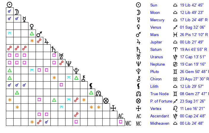 | Sun | 19 Libra 43 | 20 Libra 36 | 17 Aquarius 3 |