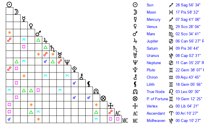 | Moon | 17 Pisces 59 | 18 Capricorn 21 | 15 Cancer 51 |