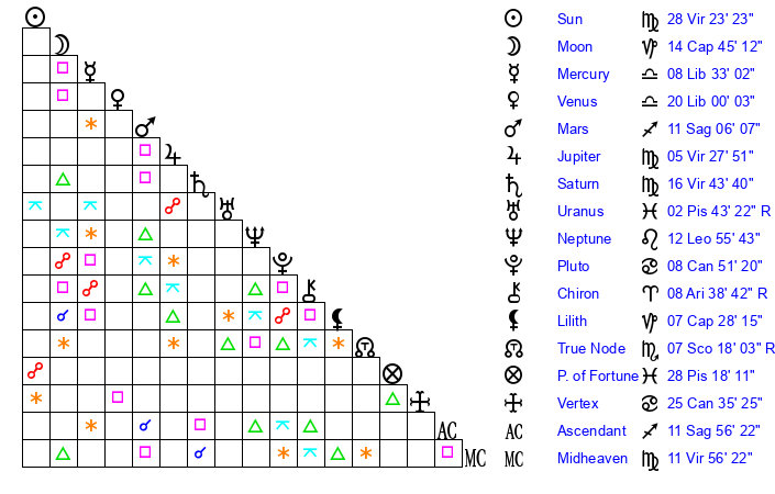 | Saturn | 17 Virgo 21 | 28 Pisces 21 | 25 Virgo 30 |