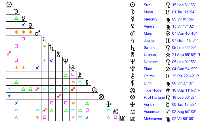 | Sun | 15 Leo 31 | 16 Leo 23 | 1 Sagittarius 51 |