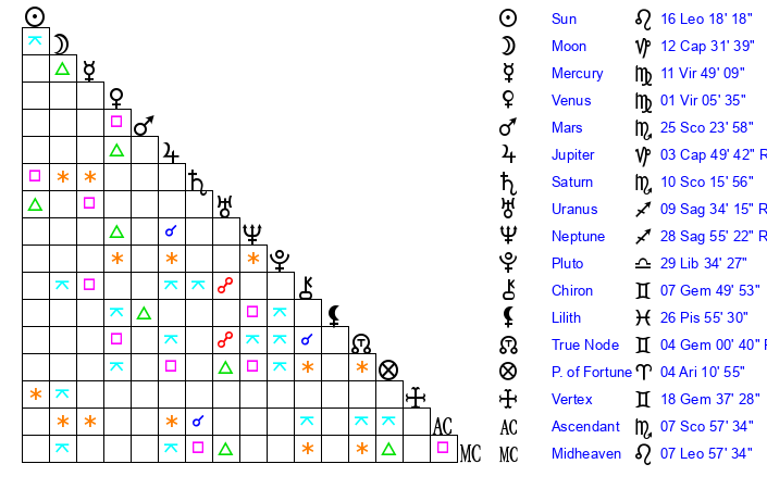 | Moon | 12 Capricorn 25 | 8 Aquarius 41 | 29 Gemini 32 |