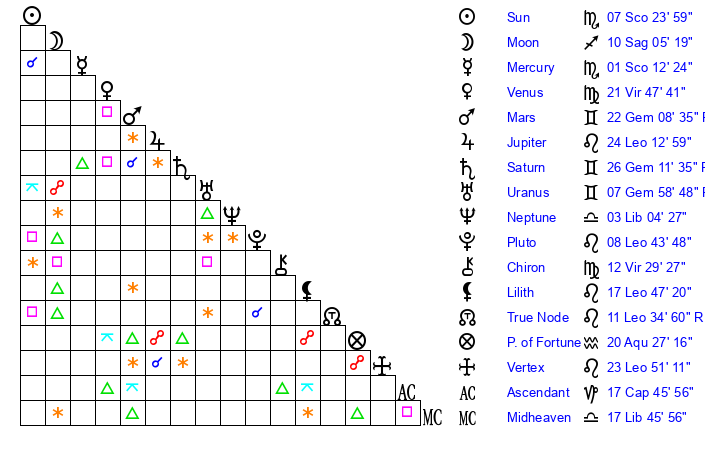 | Sun | 7 Scorpio 24 | 8 Scorpio 31 | 0 Aquarius 33 |
