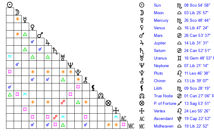 | Neptune | 7 Libra 22 | 29 Pisces 46 | 8 Libra 35 |