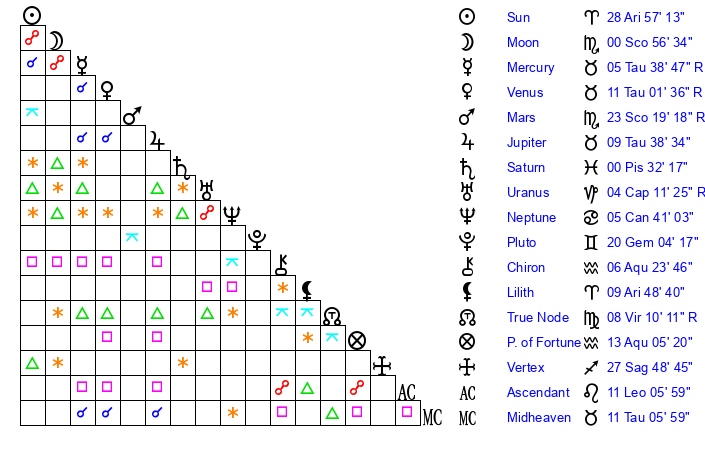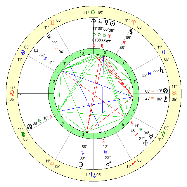 | Sun | 28 Aries 57 | 29 Aries 53 | 24 Leo 5 |