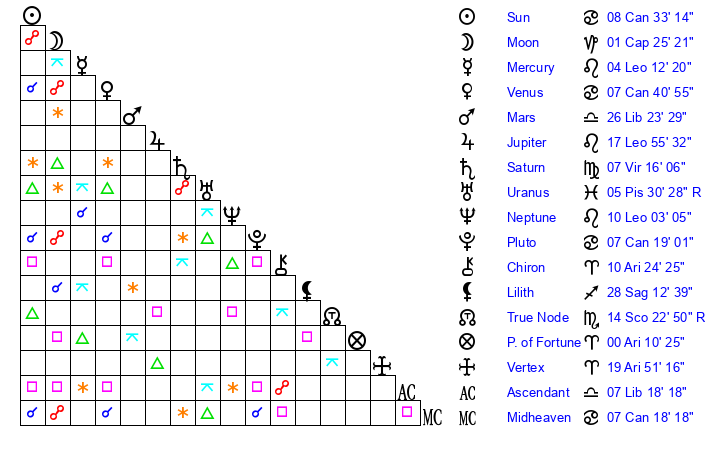 | Pluto | 7 Cancer 18 | 3 Aquarius 8 | 8 Cancer 54 |