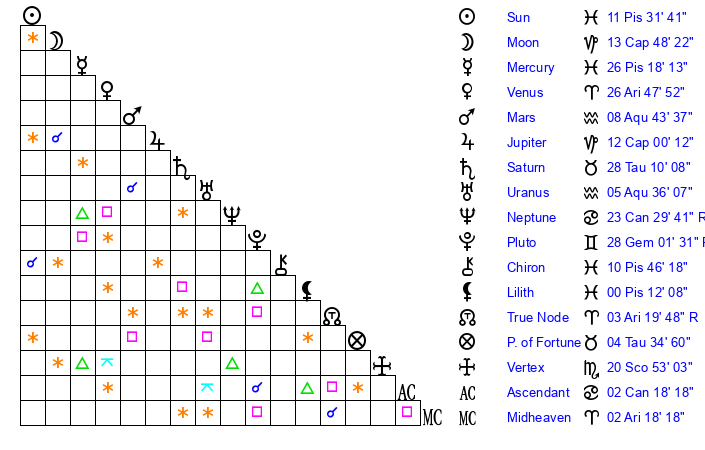 | Mercury | 26 Pisces 18 | 29 Pisces 0 | 21 Cancer 43 |
