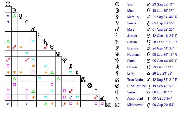 | Moon | 18 Leo 31 | 18 Capricorn 21 | 19 Cancer 8 |