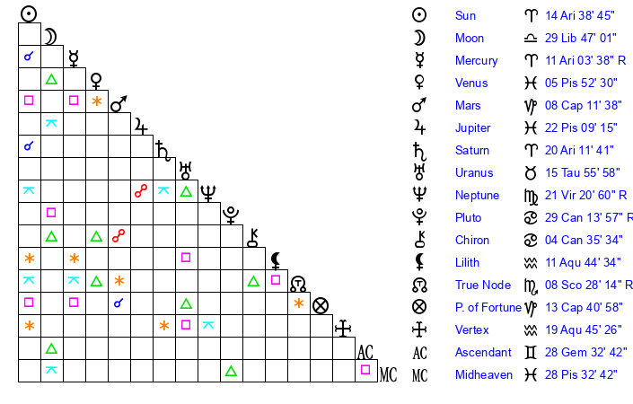 | Sun | 14 Aries 38 | 15 Aries 47 | 7 Cancer 38 |