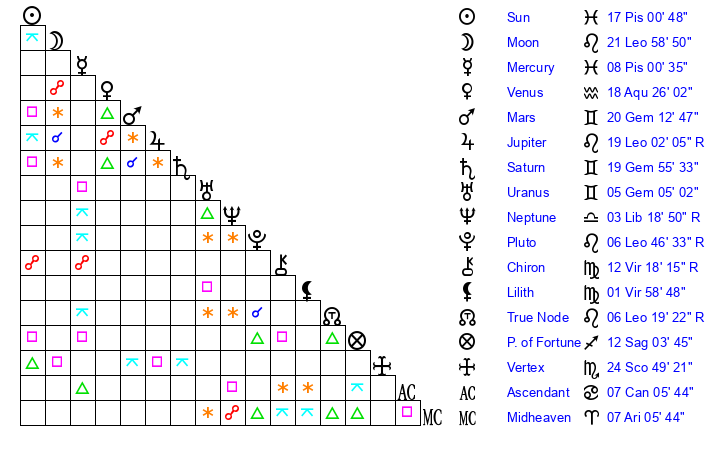 | Sun | 17 Pisces 1 | 17 Pisces 22 | 6 Gemini 15 |