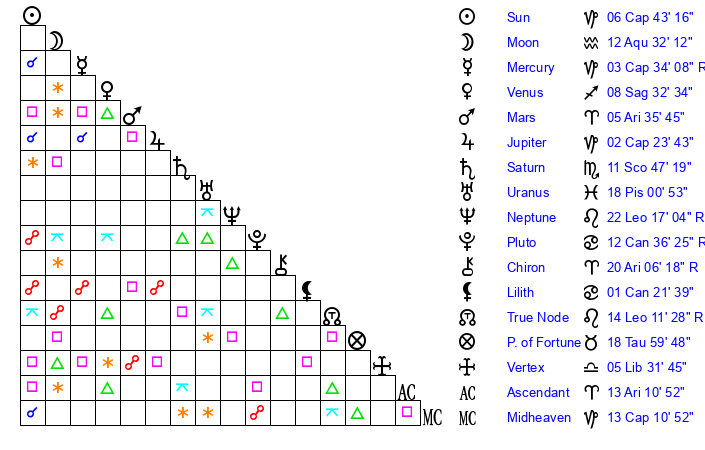 | Saturn | 12 Scorpio 18 | 25 Pisces 53 | 13 Scorpio 16 |
