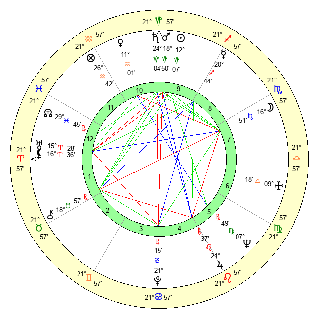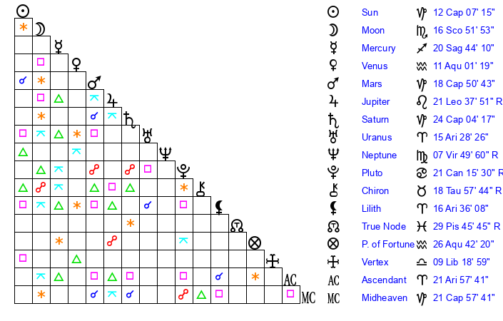 | Moon | 16 Scorpio 56 | 0 Pisces 52 | 11 Aries 48 |
