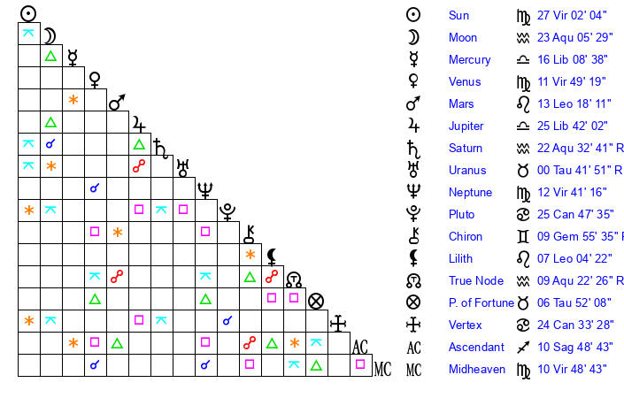 | Moon | 23 Aquarius 8 | 14 Virgo 58 | 26 Gemini 12 |