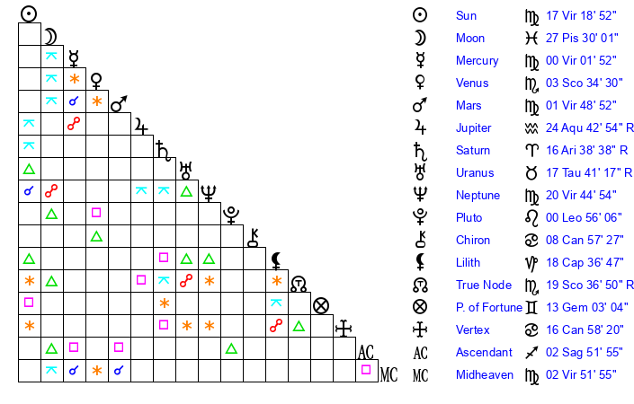 | Sun | 17 Virgo 18 | 18 Virgo 14 | 13 Sagittarius 55 |