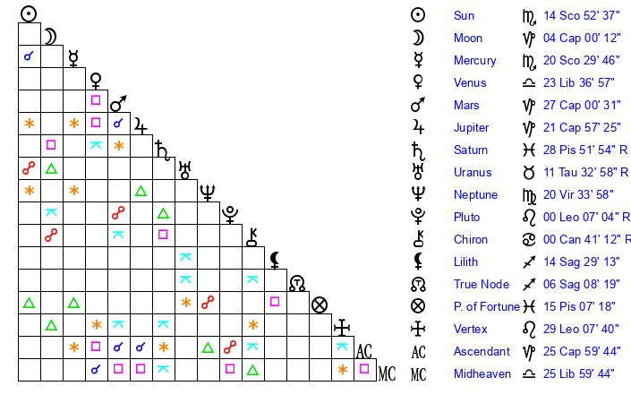 | Sun | 14 Scorpio 52 | 15 Scorpio 32 | 14 Aquarius 13 |