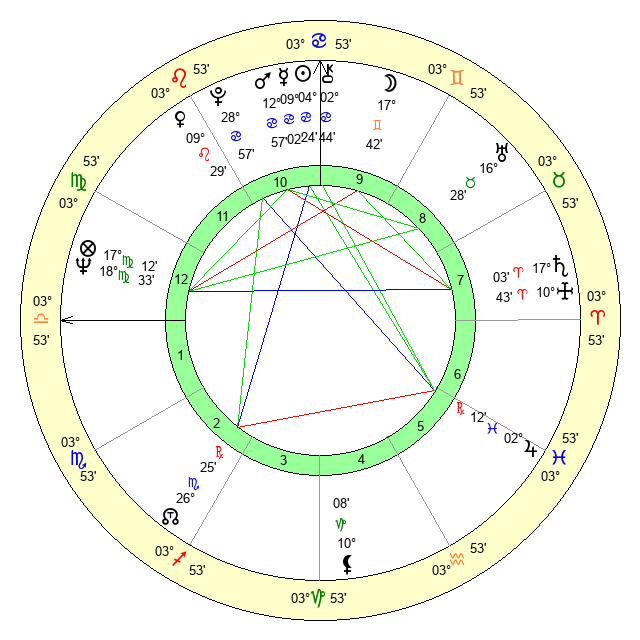 | Moon | 17 Gemini 44 | 22 Cancer 20 | 29 Leo 19 |