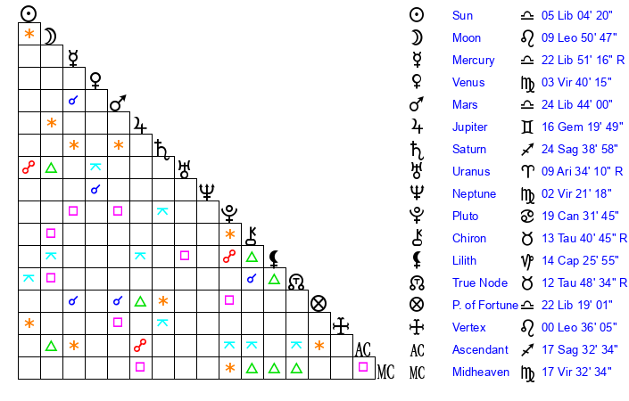 | Mercury | 22 Libra 51 | 17 Libra 30 | 0 Aquarius 21 |