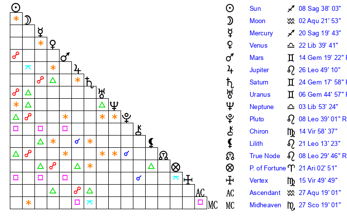 | Sun | 8 Sagittarius 38 | 9 Sagittarius 45 | 1 Pisces 57 |