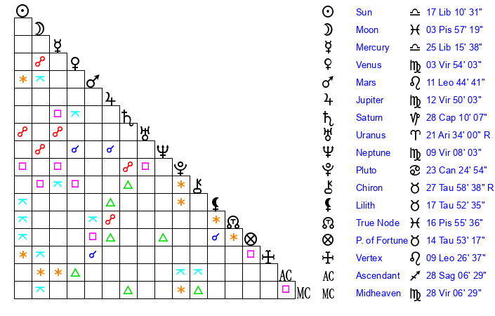 | Mars | 11 Leo 44 | 12 Scorpio 31 | 19 Virgo 45 |