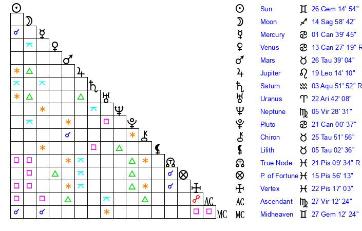 | Sun | 26 Gemini 15 | 26 Gemini 45 | 25 Virgo 33 |