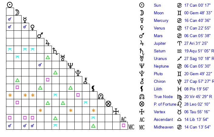 | Venus | 17 Cancer 23 | 5 Gemini 37 | 16 Sagittarius 33 |