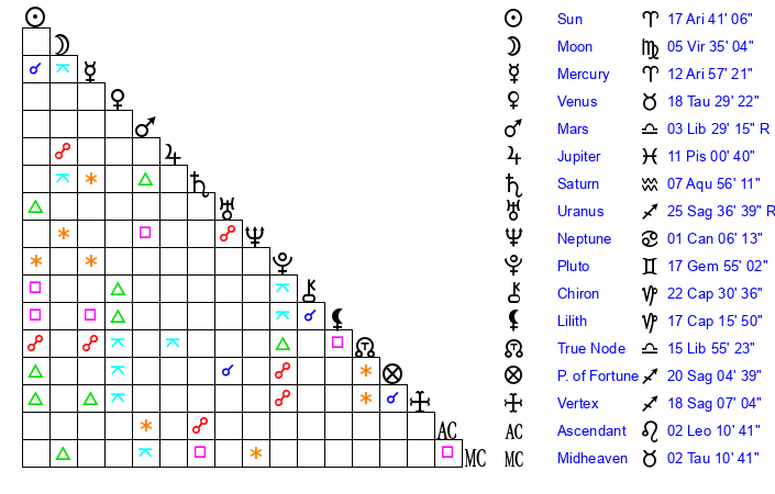 | Sun | 17 Aries 41 | 19 Aries 6 | 14 Leo 57 |