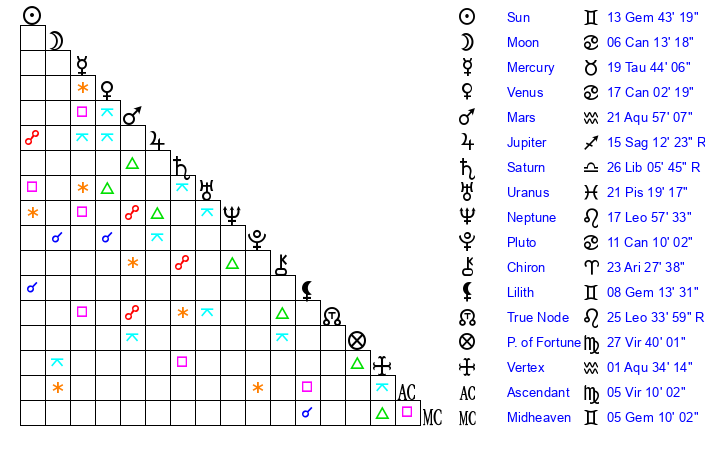 | Sun | 13 Gemini 43 | 14 Gemini 17 | 20 Virgo 34 |