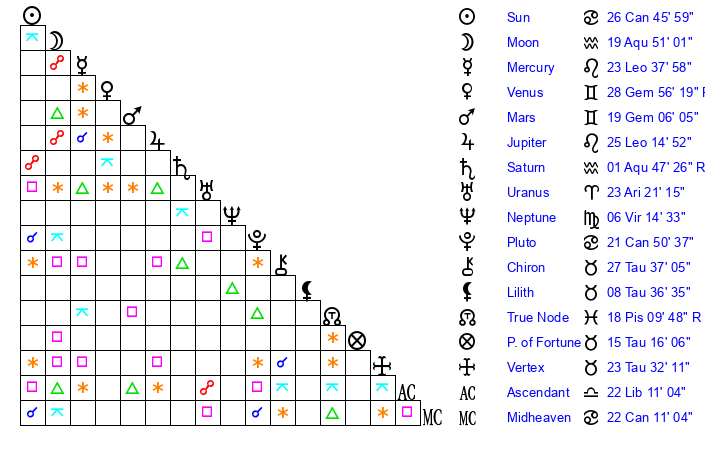| Pluto | 21 Cancer 50 | 2 Aquarius 42 | 23 Cancer 27 |