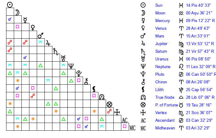 Moon | 0 Aquarius 30 | 3 Gemini 50 | 25 Scorpio 57 |