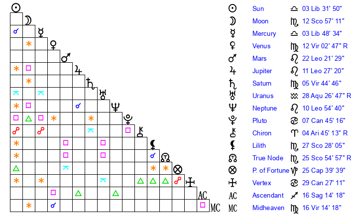 | Saturn | 6 Virgo 23 | 27 Pisces 53 | 12 Virgo 5 |